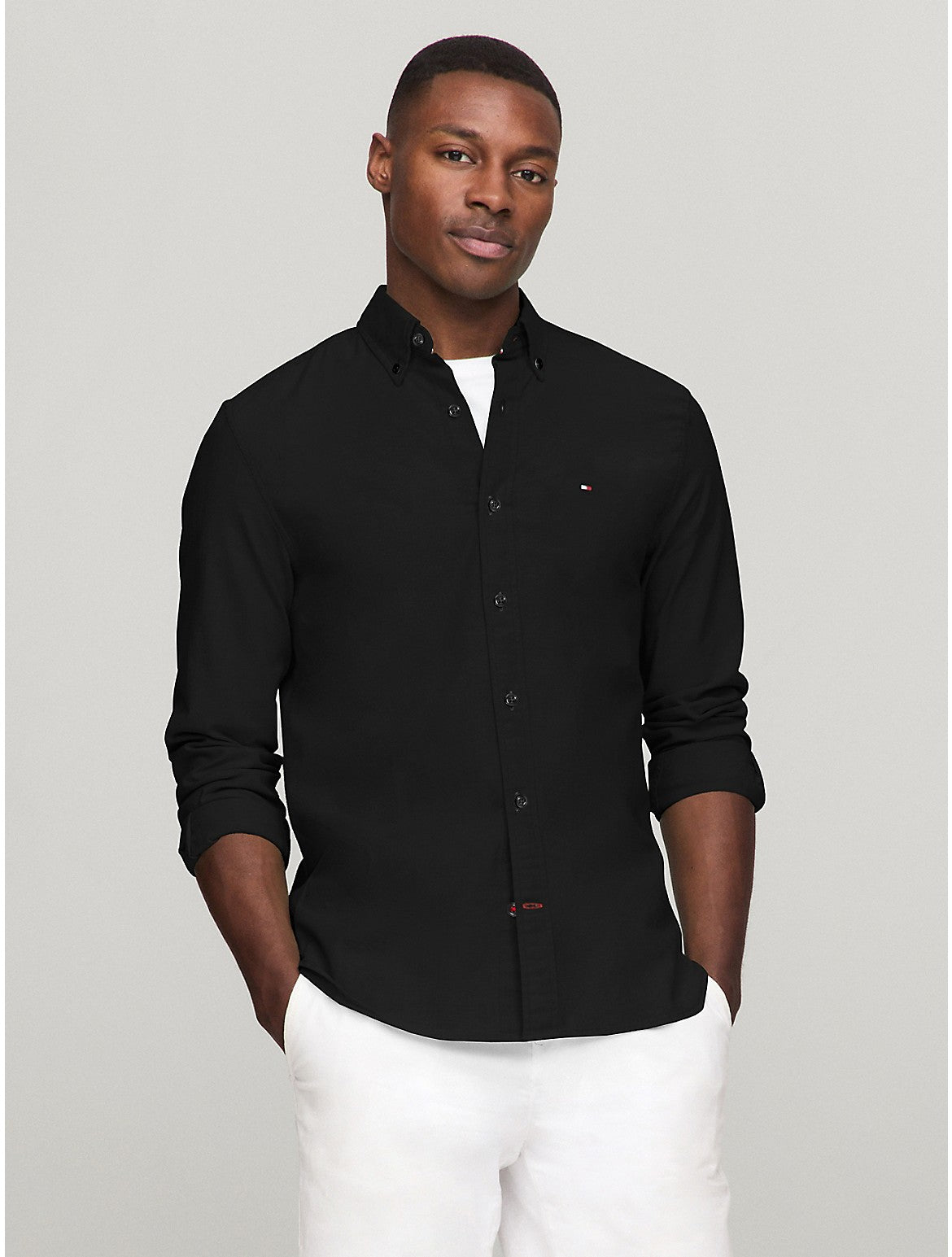 Tommy Hilfiger men's shirt. Embrace classic, easy-going style with this Oxford shirt, distinguished by its easy fit and comfortable stretch-cotton construction. Material - 98% Cotton, 2% Elastane.